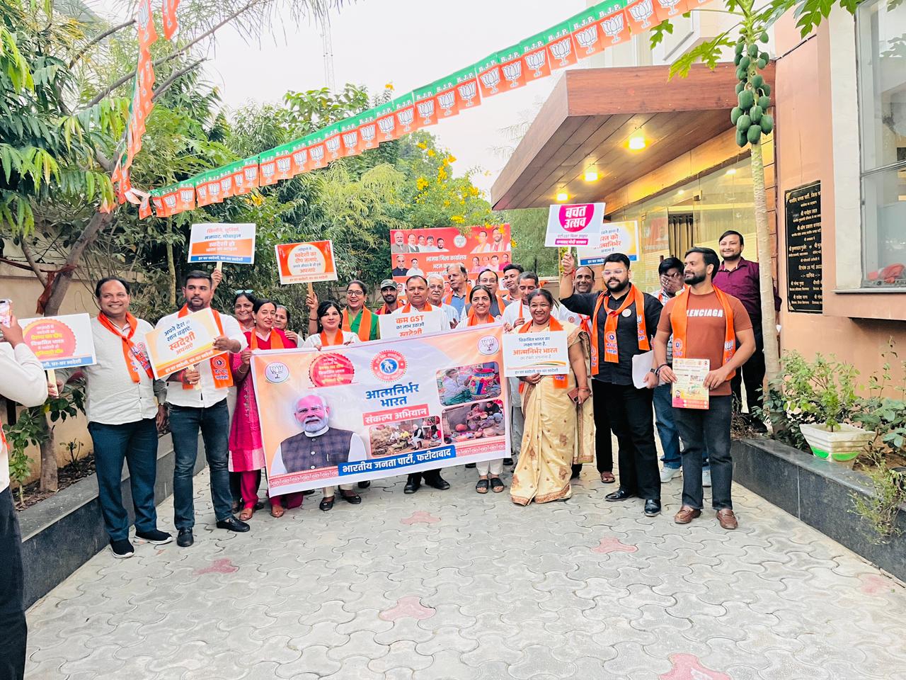 प्रधानमंत्री श्री नरेंद्र मोदी के ‘वोकल फॉर लोकल’ और ‘आत्मनिर्भर भारत’ के आह्वान को धरातल पर उतारते हुए भारतीय जनता पार्टी फरीदाबाद द्वारा इस कार्यक्रम की जिला संयोजक सीमा भारद्वाज व सह संयोजक गिर्राज त्यागी, तरनजीत सिंह व नीरज मित्तल जी के नेतृत्व में दीपावली से पूर्व फरीदाबाद की सेक्टर-15 मार्किट व उसके आस पास रियाशी इलाके में और सैक्टर 12 पेबल डाउन टाउन माल के पास स्वदेशी वस्तुओं के उपयोग के लिए जन-जागरूकता अभियान चलाया गया। इस अभियान के अंतर्गत भाजपा कार्यकर्ताओं ने घर-घर जाकर नागरिकों को स्वदेशी उत्पादों के उपयोग के लिए प्रेरित किया गया, स्टीकर लगाए व संकल्प पत्रक भरवाए और बाजारों में व्यापारियों से भी अपील की गई कि वे अधिक से अधिक देश में निर्मित उत्पादों की बिक्री करें और स्वदेशी के लिए ग्राहकों को प्रेरित करें।