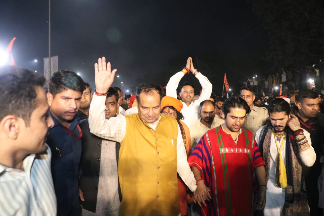 Faridabad Hindustanabtak.com/Dinesh Bhardwaj : 10 नवम्बर। हरियाणा भाजपा के प्रदेश अध्यक्ष पंडित मोहन लाल बडौली बागेश्वर धाम के पीठाधीश्वर धीरेंद्र कृष्ण शास्त्री द्वारा निकाली जा रही सनातन हिंदू एकता पदयात्रा में शामिल हुए। भाजपा प्रदेश अध्यक्ष बड़ौली बल्लभगढ़ में पदयात्रा के दौरान धीरेन्द्र शास्त्री का हाथ पकड़कर काफी दूर तक चले। इस दौरान धीरेन्द्र शास्त्री और पंडित मोहनलाल बडौली के साथ सैकडों सनातनी हाथों में भगवा ध्वज लेकर सनातन समर्थन में जय जयकार का उदघोष करते रहे। भाजपा के वरिष्ठ नेता संदीप जोशी भी इस दौरान साथ रहे।
