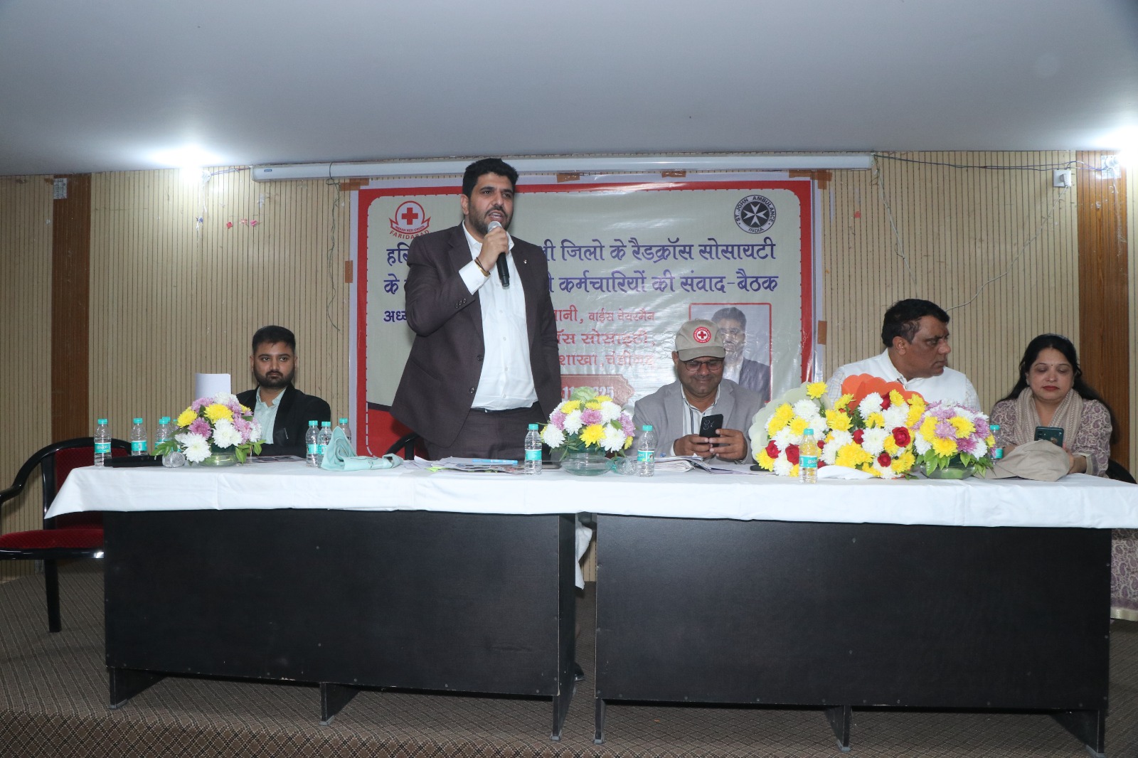 बैठक के दौरान मंच का संचालन पुरुषोत्तम सैनी, उपाधीक्षक रेडक्रॉस सोसायटी, फरीदाबाद द्वारा किया गया इस दौरान उन्होंने उपस्थित सभी कर्मचारियों को रेडक्रॉस द्वारा जो मानवहित कार्य किए जाते है उनमें अधिक से अधिक जुड़ने के लिए प्रेरित किया।