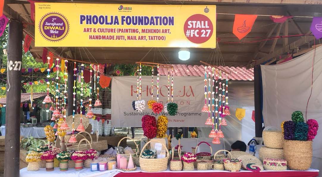 Faridabad Hindustanabtak.com/Dinesh Bhardwaj : 6 अक्टूबर। जिला फरीदाबाद के सूरजकुंड में आत्मनिर्भर भारत-स्वदेशी मेला थीम पर आयोजित किया जा रहा दीपावली मेला प्रधानमंत्री नरेंद्र मोदी के आत्मनिर्भर भारत और स्वदेशी विजन को मजबूती प्रदान कर रहा है। दीपावल मेले में बुलंदशहर के गांव जुगसाना कलां से आए प्रदीप चंद्रा द्वारा मक्का के छिलकों से अनूठी कारीगरी करते हुए बैठने का सामान सहित आकर्षक फूल, गुलदस्ते और अन्य सजावटी सामान बनाए गए हैं, जो घर-घर की शोभा बढ़ाते हैं। प्रदीप चंद्रा ने बताया कि ये सभी प्रोडक्ट फूलजा फाउंडेशन के सहयोग से गांव की महिलाओं द्वारा मक्का के छिलकों से तैयार किए जाते हैं, जिससे उनकी आर्थिक स्थिति मजबूत हो रही हैं और महिला सशक्तिकरण का बढ़ावा मिल रहा है।